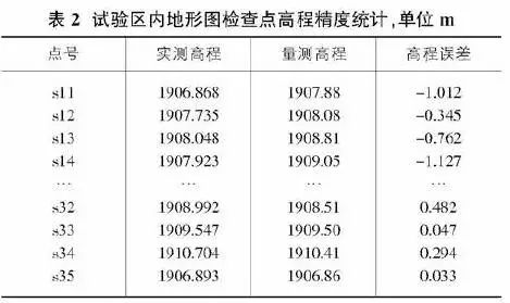 为了验证试验区内地形图检查点的高程精度,本次在实验区均匀实测2 5 个高程检查点,通过等高线内插高程值的方法计算出实测点在被测目标区域内的图上高程,通过对比高程中误差进行高程精度分析,统计见表2所示。