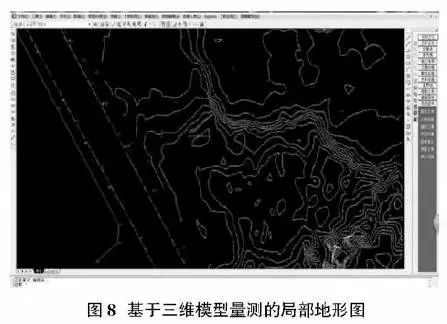 为了检验基于三维模型量测地形图的可行性和精度,本次实验在试验区采用RTK 技术均匀量测一些特征点,包括道路拐角、房角,墙角、井盖,沟渠等可以快速识别的特征点,以这些实地量测的检查点坐标作为已测地形图的检核点。在生成的三维模型上均匀取大量的地形地物点,将这些点导入CASS中成图,见图8 所示。通过判断检查点点位中误差和高程中误差的大小是否满足测绘大比例尺地形图的规范要求,进行验证基于三维模型量测地形图的可行性和精度。