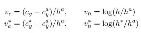 2. 在Conv5的feature map的每个位置上取 3*3*C 的窗口的特征,这些特征将用于预测该位置 k 个 anchor(anchor的定义和Faster RCNN类似)对应的类别信息和位置信息。k个anchor尺度和长宽比设置:宽度都是 16,k = 10,高度从11~273(每次除于0.7)。回归的高度和bounding box的中心的y坐标如下,带*的表示是 ground Truth,带 a 的表示是 anchor。