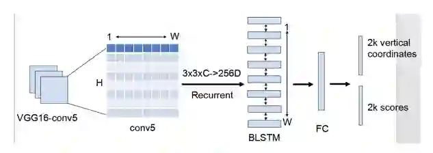 3. 接着我们把CNN和RNN进行无缝衔接。将每一行的所有窗口对应的 3*3*C的特征(W*3*3*C)输入到RNN(BLSTM)中,得到W*256的输出。在这里,RNN的类型是BLSTM(双向LSTM),每个 LSTM有128个隐含层,所以RNN的输出是256维特征。RNN的输入是,每个滑动窗口的3*3*C的特征(可以拉成一列),同一行的窗口的特征形成一个序列。