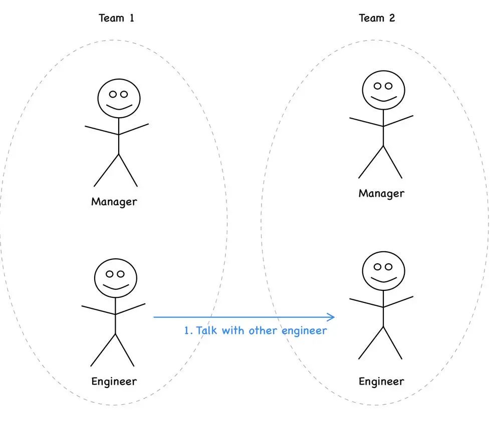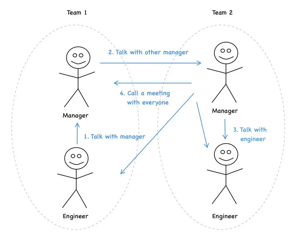 传统公司会鼓励分层沟通。这样做不仅是为了“屏蔽”工程师,也是因为这些地方的管理人员更愿意成为信息枢纽,不放弃对这部分的控制。以下是向其他团队提出问题或进行询问的过程,通常如下: