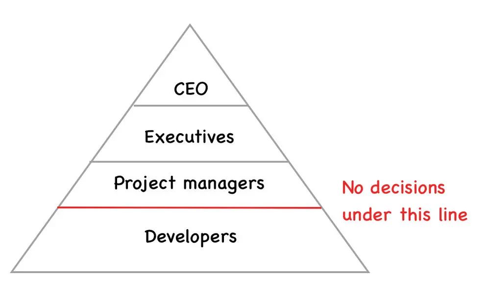 在传统的公司,让开发者做别人吩咐的事的理念,通常会导致层级结构的形成。我曾和一家银行的人聊过,这家银行的项目管理的层次有六层。开发人员处于最底层的两个层次。决定可以从第三个层次开始做。基本上,那些做这项工作的人没有发言权——这是设计好的。我是否需要补充一句,这家银行正在为他们的软件部门如何工作而挣扎?