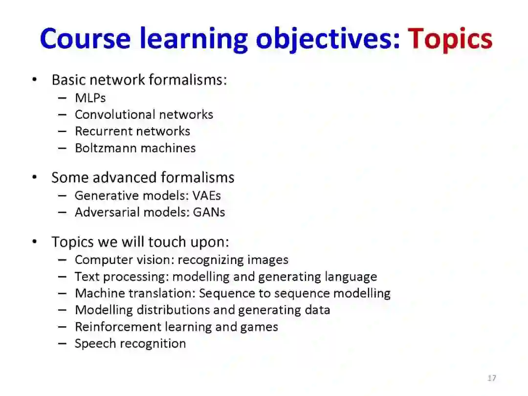 在本课程中,我们将学习深度神经网络的基础知识,以及它们在各种人工智能任务中的应用。在本课程结束时,预计学生将对这门学科非常熟悉,并能够将深度学习应用于各种任务。他们也将被定位去理解关于这个主题的许多当前的文献,并通过进一步的学习来扩展他们的知识。