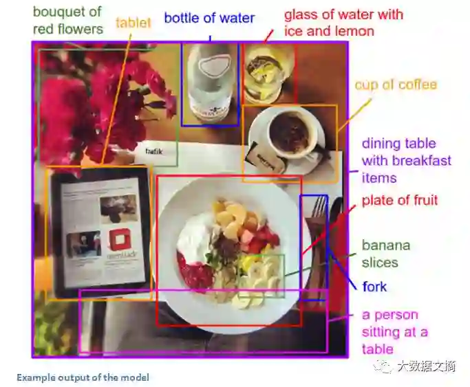 现在让我们考虑将这些图像表现出来。 第一步是将图像送到R-CNN中,以便检测各个物体。 该R-CNN已对ImageNet数据进行了训练。 最先的19个(加上原始图像)对象区域被嵌入到500维的空间中。 现在我们有20个不同的500维向量(在论文中由v表示)。 我们有了关于图像的信息,现在我们想要有关句子的信息。 我们通过使用双向循环神经网络,将单词嵌入到同一个多模态空间中。 从最高层次来说,这是用来说明给定句子中单词的上下文信息的。 由于关于图片和句子的信息都在相同的空间中,我们可以通过计算它们的内积来得到它们的相似度。