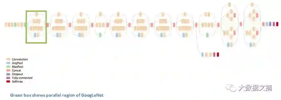 让我们来看一下GoogLeNet的结构。我们首先要注意到一点:并不是所有的过程都按顺序发生。如上图所示,GoogLeNet里有并行进行的网络结构。