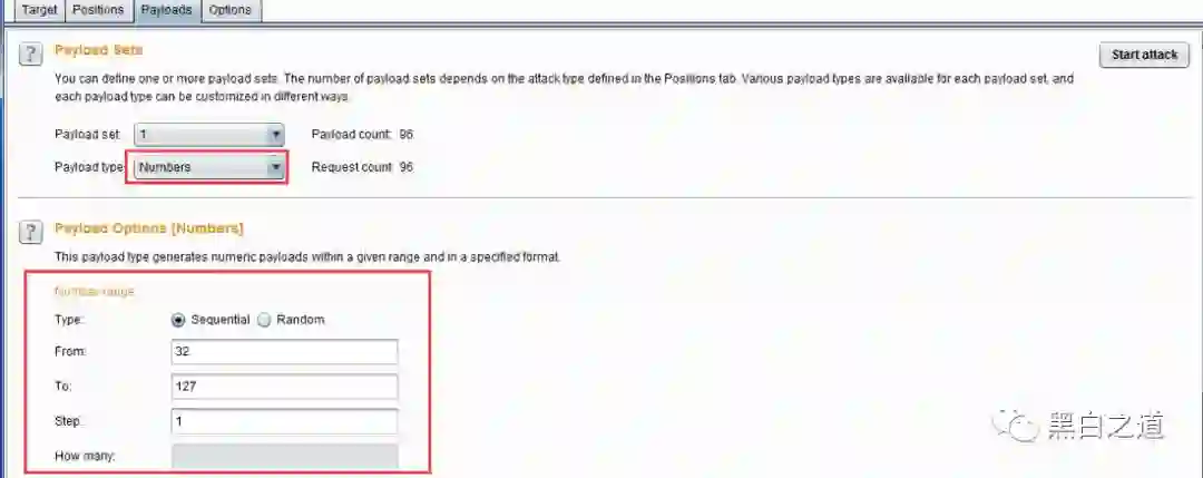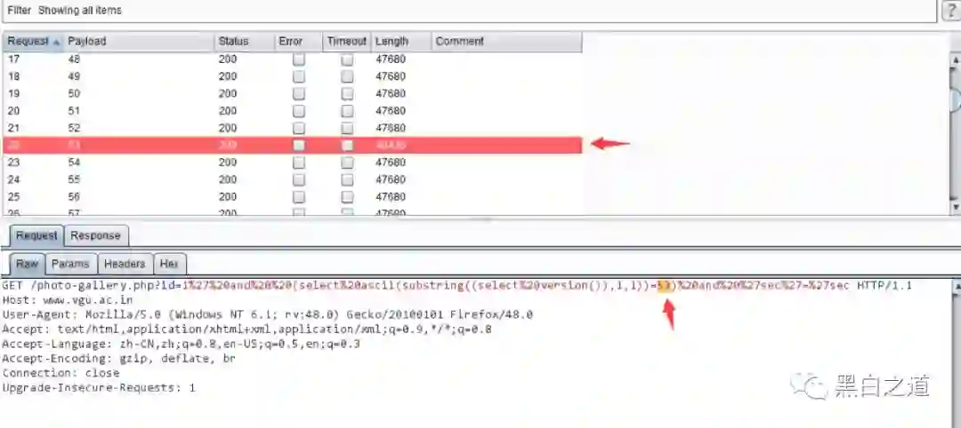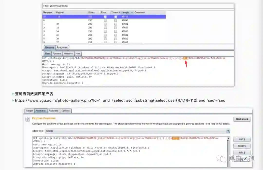 查询数据库版本,大家可能也看到了,盲注的本质,其实就是逐个字符的截取判断,像这种重复性的操作,如果纯手工来的话,估计得累死,还是老办法,我们直接拿burpsuite跑一下就好了,根据经验,像版本号一般都不会太长,20个足矣,常用的ascii码值,一般也都会在32-127之间,下面只是跑第一位字符,后面你还可以接着把第二位,第三位……字符都按同样的方法跑出来,像这些基础函数在前面都已经详细说明过了,实在不明白可以去看那个