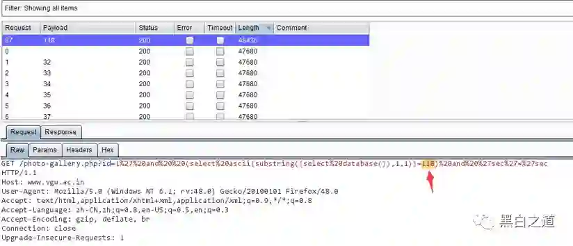 我们看到数据库名的第一个字符对应的 ascii 码值为 118,其对应的字符为’v’,遍历后的最终结果为'vguac_web'