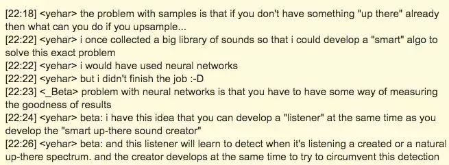 我2000年开始考虑使用神经网络为上采样(重新采样到更高的采样频率)的数字音频生成缺失的高频,以令人信服而不是准确的方式。2001年我收集了音频库进行训练,以下是从2006年1月20日开始的EFNet#musicdsp Internet Relay Chat(IRC)日志的一部分,其中我 (yehar) 与另一个用户 (_Beta) 讨论了这个想法:
