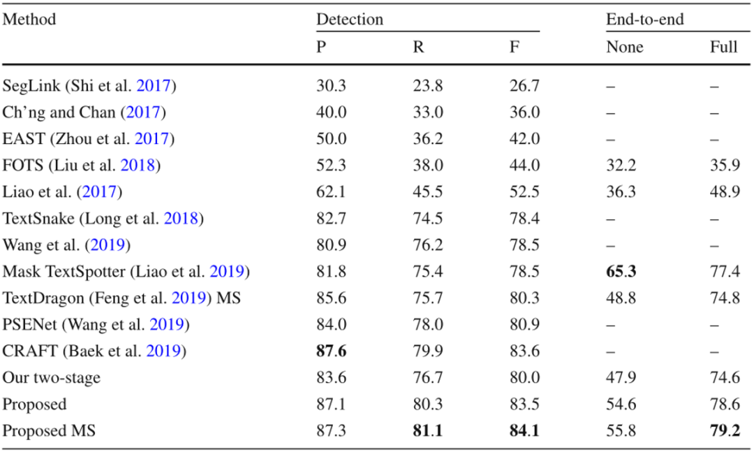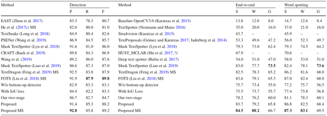 本文在五个公开数据集上评价了提出的方法,包含两个任意形状文本数据集和三个多方向数据集,其中四个是英文数据集,另一个数据集主要包含中文。如Table 1所示,文中的方法在CTW1500上达到了最佳的性能,尽管CTW1500包含很多长文本行,但是所提出的自底向上检测器不受感受野的限制。这使得该方法相对于基于自顶向下的方法有明显的优势。文中的方法同样在Total-Text达到了最佳性能,如Table 2所示。由于Total-Text要求词级别的检测,所以这个数据集的难点在于区分相邻的文本行。受益于所提出的自顶向下检测器,该方法可以很容易的区分相邻的文本行,使该方法不受粘连问题的影响。如Table 3,4,5所示,该方法同样在三个多方向数据集上获得了最佳的性能。尽管该方法是针对任意形状文本行设计的,但是和之前针对四边形文本设计的方法相比,该方法取得了更佳的性能。此外在中文数据集CASIA-10K上,尽管中文文本行尺度变化更为丰富,所提出的残差双尺度机制使该方法对尺度变化更鲁棒,结果显示该方法可以同时处理中文和英文。