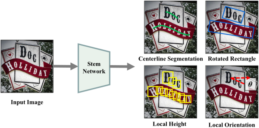 关于任意形状文本检测器,本文采用预测文本行局部几何特征的方式。并增加了自顶向下的检测器来解决相邻文本行的粘连问题。检测器的输出如Fig.4所示。检测器主要包含三个任务:第一个任务是中心线分割任务,这个任务可以被看作像素级别的分类任务。第二个任务是自底向上的检测任务,这个任务的目的是描述文本行的局部几何特征,包含局部高度和局部角度。最后一个任务是自顶向下的检测任务,这个任务用旋转矩形的形式来表示文本行感兴趣区域,被检测到的文本感兴趣区域将在推理阶段带来更好的分词效果。