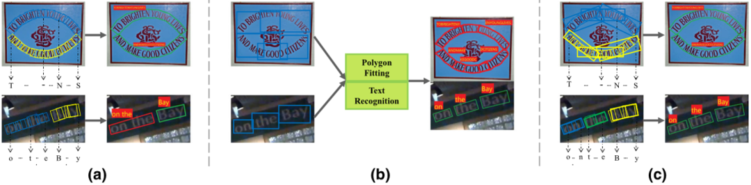 针对任意形状场景文本端到端识别的方法可以被大致分为自底向上和自顶向下两类。自底向上的方法[1]将文本行看作局部区域的组合,通过首先检测和识别局部区域,之后将结果融合的方式完成端到端识别。然而,其中的融合操作容易受到粘连问题的影响,如Fig.1 (a)所示。与自底向上的方法不同,自顶向下的方法[2,3]首先检测图中所有文本行感兴趣区域,之后在感兴趣区域内部进行多边形拟合以及文本识别。因此,这类方法可以直接检测文本行区域,而不需要对局部区域进行融合。然而,这些方法需要足够大的感受野来覆盖文本行区域。当文本行较长时,一个文本行容易被错误的分成几个独立的区域,如Fig.1 (b)所示。