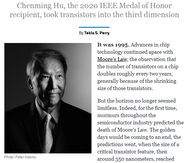 胡正明教授在多个场合表示,集成电路产业可再成长100 年,芯片功耗还可降低 1000 倍。线宽的微缩总是有一个极限的,到了某种程度,就没有经济效应驱动人们把这条路径继续走下去。但是我们并不一定非要一条路走到黑,我们也可以转换一个思路,同样可能实现我们想要达到的目的。