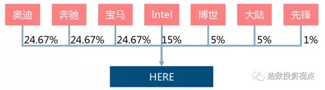 Here 前身为美国地图公司 NAVTEQ,2008 年被诺基亚以 81 亿美元的价格收购NAVTEQ,并入自己的 Here 地图部门。2015 年 4 月,诺基亚宣布剥离 Here 部门,吸引了宝马、奔驰、奥迪、谷歌、Uber、Facebook、百度、腾讯(联合四维图新)来竞标。最终奔驰、宝马、奥迪临时组成的联合体以 28 亿欧元(约 31 亿美元)全资收购 Here,三家各占 1/3 的股权。Here 的地图数据覆盖约 200 个国家,超过 4600 万公里。