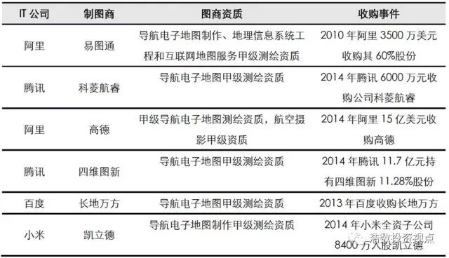 和美国不同,我国有比较严格的地图测绘政策限制,目前拥有「导航电子地图资质单位名单」的企业有 14 家。分别是四维图新、高德、长地万方、凯德、易图通、城际高科、国家基础地理信息中心、科菱航睿、光庭信息、浙江省第一测绘院、江苏省基础地理信息中心、灵图、立德空间信息、滴图科技。百度地图就是通过子公司长地万方开展导航电子地图测绘的。