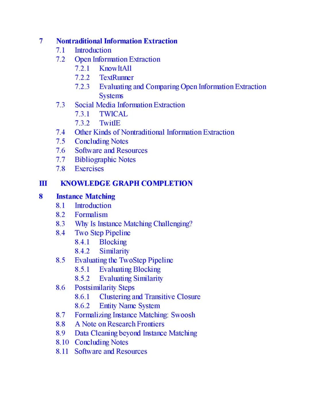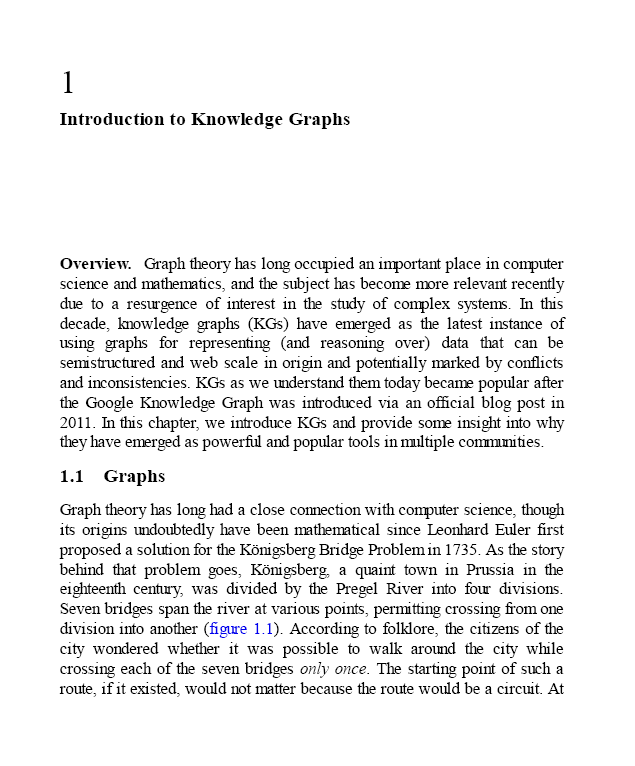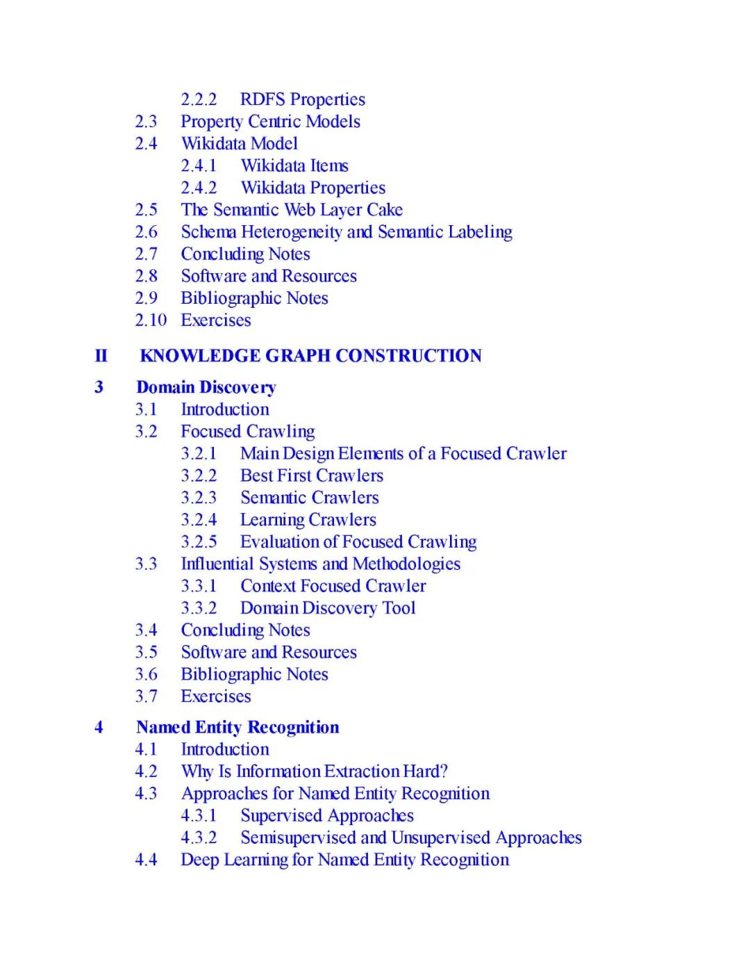 在介绍了介绍性和背景材料之后,本文涵盖了构建知识图谱、向知识图谱添加新知识(或在知识图中精炼旧知识)以及访问(或查询)知识图谱的技术。最后,书中描述了特定的知识图谱生态系统,与每个生态系统对应的几个现实世界的应用和案例研究。每一章结尾都有软件和资源部分,以及建议阅读的参考书目。章末练习共130个,代表了不同的抽象层次。