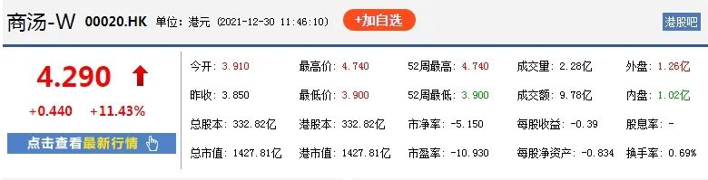 截止发稿,商汤集团报价4.29港元/股,最新总市值为1427.81亿港元。