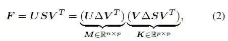 如下式所示,F 可以通过 SVD 分解直接求解均值 M 和一个表征分布聚集程度的聚集项 K。其中,Δ=diag (1,1,|UV|) 是一个对角正交矩阵,用于保证 M 的行列式为 1,从而能落在特殊正交群中。