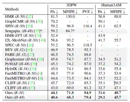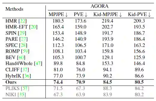 实验部分,本研究在公开数据集 Human3.6M、3DPW、AGORA、TotalCapture 上和过去方法进行了定量对比。可以看到,本研究的方法超越了过去的一众方法。其中右下表中最后灰色的两行是同期工作,这里为了榜单完整性也列了出来。