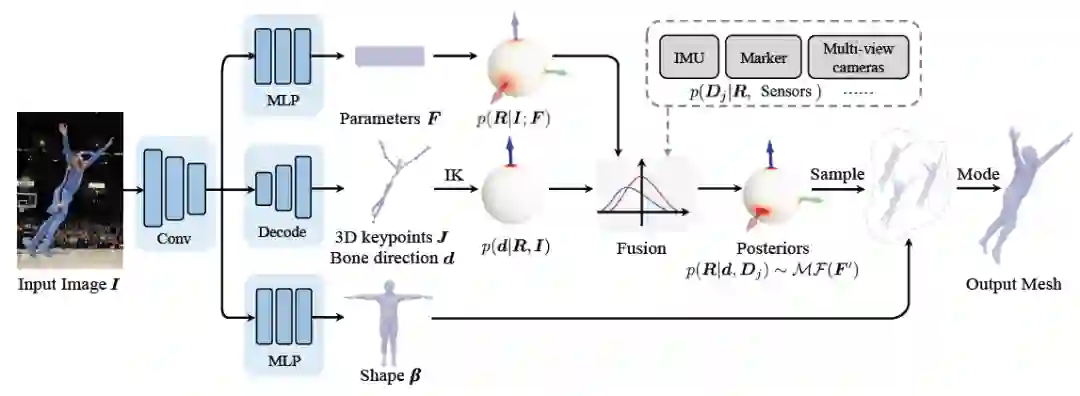 本研究对人体姿态进行概率建模,目标是求关节旋转 R 在一些观测变量条件下(如骨骼朝向 d 等)的后验概率 p (R|d,⋯)。