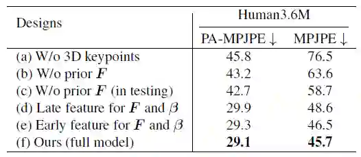 基于前述理论和推导,可以直接构建出下图所示的框架图。利用多分支网络从单张图片中估计先验分布参数 F、三维关键点 J(从中计算出骨骼朝向 d)、外形参数 β。通过贝叶斯法则计算得到后验概率,最终可从后验分布中得到姿态估计,从而输出人体 mesh。
