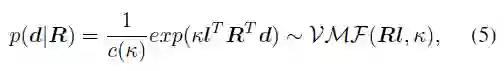 由此可得到结论:后验概率 p (R|d) 同样服从 matrix Fisher 分布,且其参数从 F 更新为 F^'=F+κdl^T。