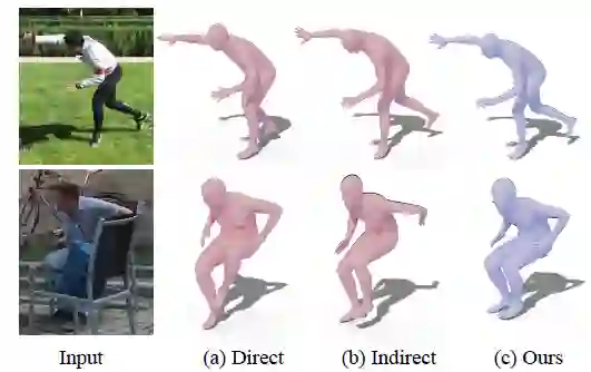 本研究的任务是从 RGB 图像中预测人体姿态和外形(human mesh recovery, hmr),现有的方法可以归纳为两类:直接法和间接法。直接法采用神经网络端到端地回归人体关节的旋转表示(如轴角、旋转矩阵、6D 向量等),而间接法先预测一些中间表示(如三维关键点、分割等),然后通过这些中间表示得到关节旋转。