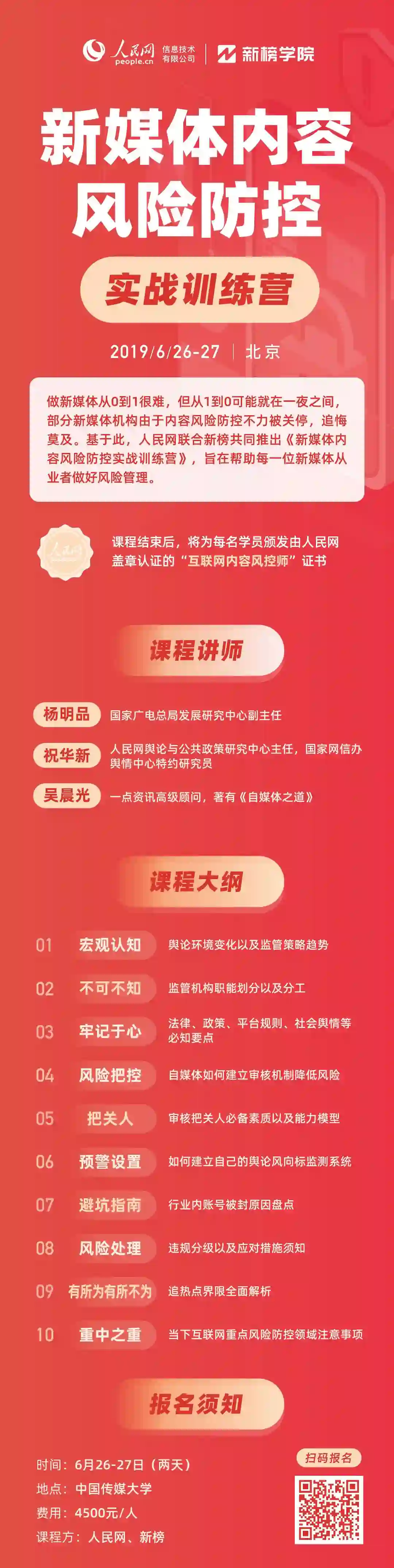 为提升互联网从业管理者内容风控意识及管理水平,人民网信息技术有限公司联合新榜共同推出「新媒体内容风险防控实战训练营」课程,帮助新媒体从业者做好风险管理。