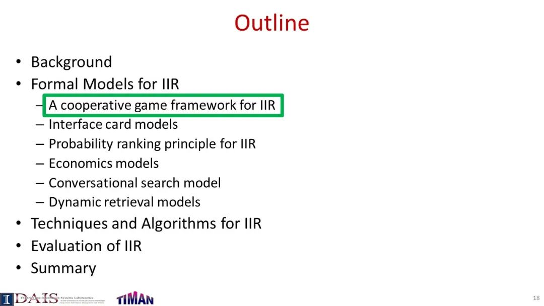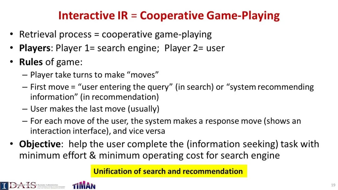 由于信息检索(IR)通常是一个交互过程,因此研究交互式信息检索(IIR)是很重要的,在IIR中,我们将尝试建模和优化整个交互式检索过程(而不是单个查询),同时考虑用户可能与搜索引擎交互的许多不同方式。本教程系统地回顾了IIR的研究进展,重点介绍了IIR的模型、算法和评估策略的最新进展。首先对IIR的研究进行了广泛的概述,然后介绍了使用合作博弈框架进行IIR的形式化模型,并涵盖了决策理论模型,如接口卡模型和IIR的概率排序原理。接下来,它提供了一个审查一些代表特定的信息检索的技术和算法,如各种形式的反馈技术和多样化的搜索结果,然后讨论了应该如何评价一个信息检索系统和多种策略提出最近使用模拟的用户评价信息检索。本教程最后简要讨论了IIR中的主要开放挑战和一些最有前途的未来研究方向。