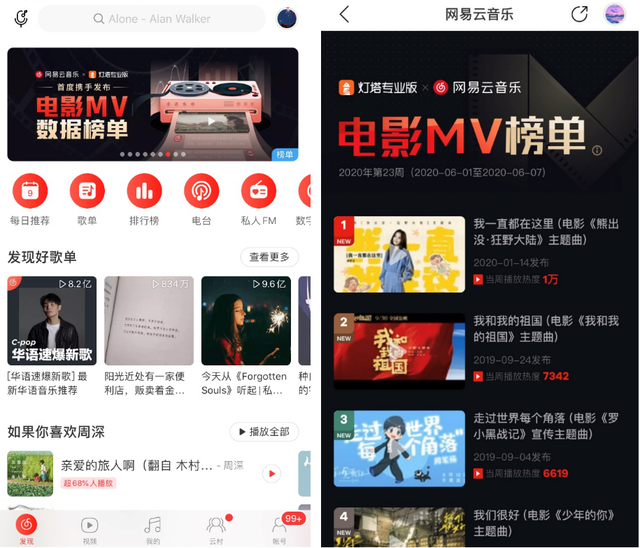 阿里影业旗下数据平台灯塔专业版与网易云音乐合作推出电影MV排行榜
