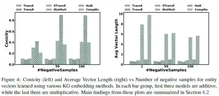 乘法模型的锥度(conicity)随着反例数量的增加而增大,而加法模型的锥度对反例数量不敏感。在平均向量长度(AVL)方面,乘法模型中的DistMult和ComplEx随着反例数量的增加而减小,HolE则几乎没有变化,这是因为HolE把实体向量限制在了单位球内。所有加法模型的AVL也对反例数量不敏感,而它们也有和HolE类似的限制。