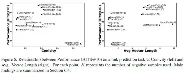 本实验以链接预测任务为例,采用与TransE相同的实验设定。当反例数量相同时,锥度小的乘法模型的性能更优;当反例数量增加时,乘法模型表现更好。加法模型的性能与锥度并无太大关系。在平均向量长度方面,对于除HolE之外的乘法模型而言,当反例数量一定时,平均向量长度越大性能越好;而对于加法模型和HolE而言,平均向量长度与性能的关系并不显著,这个现象是由于这些方法使用单位向量长度来限制嵌入向量所导致的。