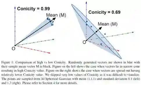 图1给出了一个实例来帮助理解这几个指标,图中是一个三维坐标系(展示的点是随机生成的),左图表示的是高锥度(conicity)和低向量分散度(VS)的情形,而右图表示的是低锥度和高向量分散度的情形。