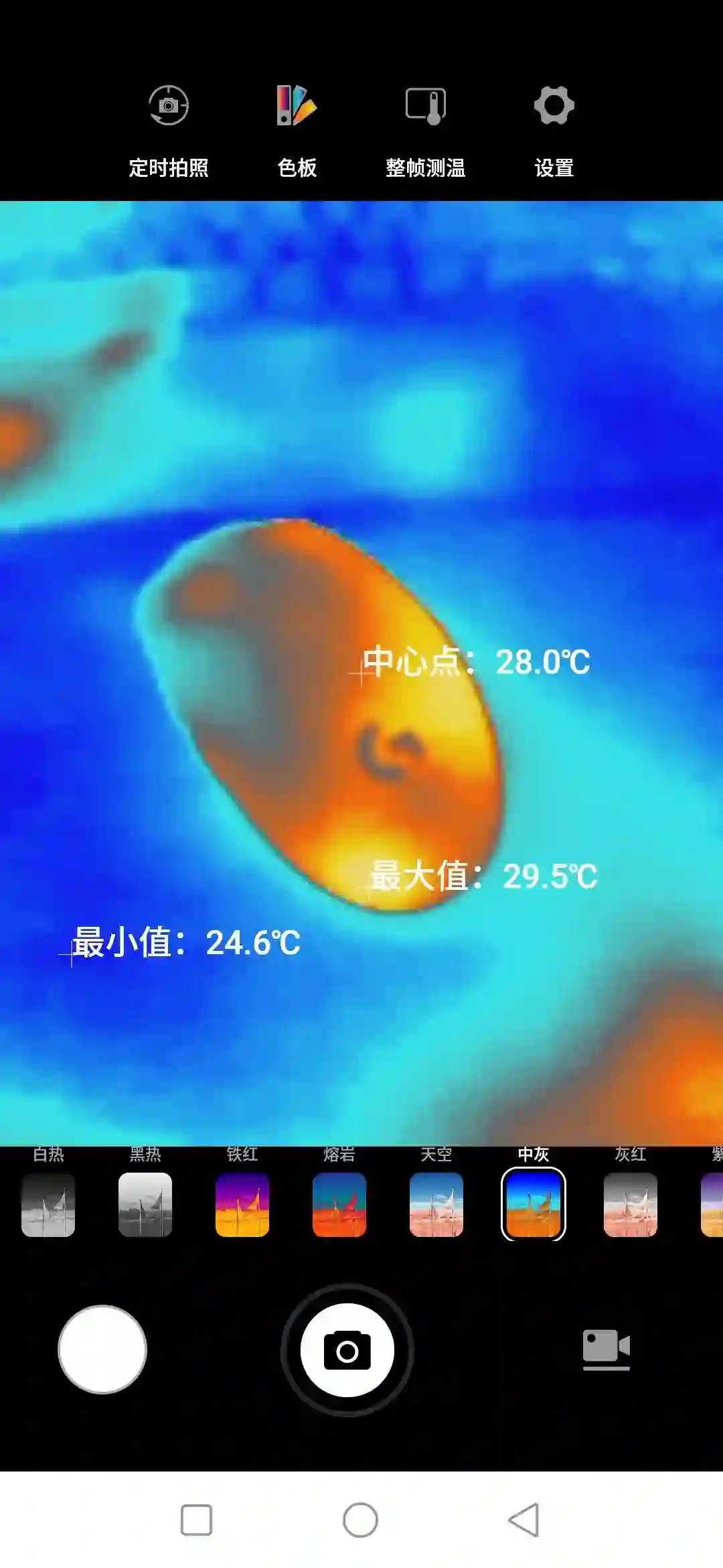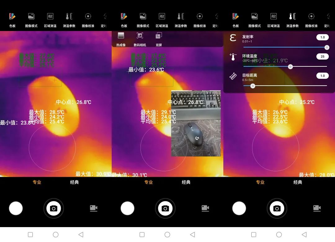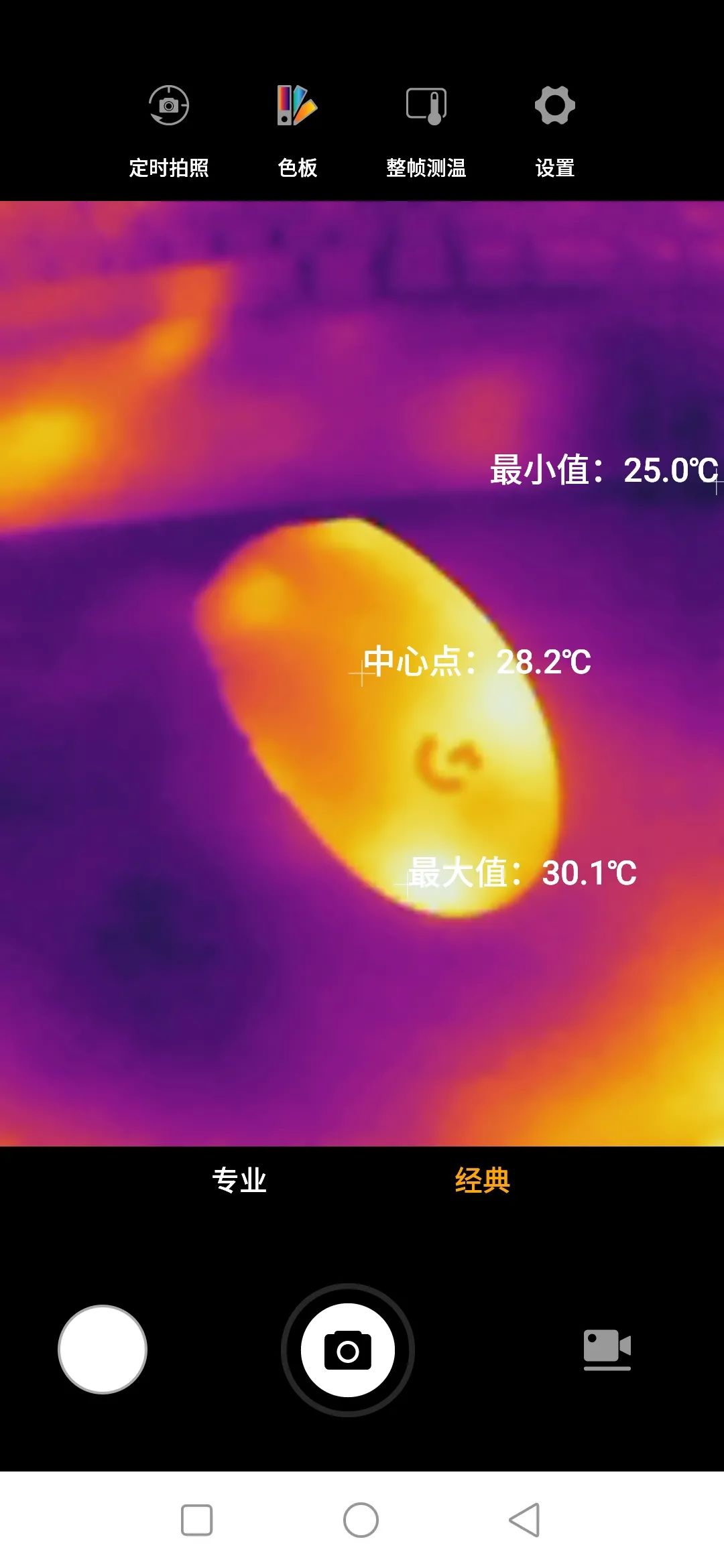 热成像使用的是单独的一个 APP,可以在简单的经典模式和专业模式进行切换。在经典模式下,可以整帧测温,屏幕会显示中心点温度,以及画面中最小和最大两个点的温度,还可以选择不同的色板和进行定时拍照。