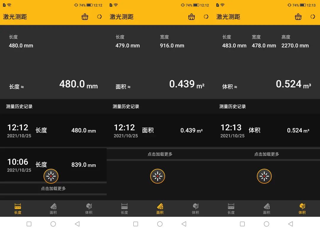 测距跟热成像一样,出厂预装了相关 APP,测量范围在 0.001 米到 20 米之间,不仅可以测直线距离,还可以测算面积以及体积。不过后两个功能目前还是有局限性,面积就是用户自身为坐标原点,测出的长宽相乘,所以你只能测方形,那体积就不用我再多说了,只能测长方体或者正方体的体积。