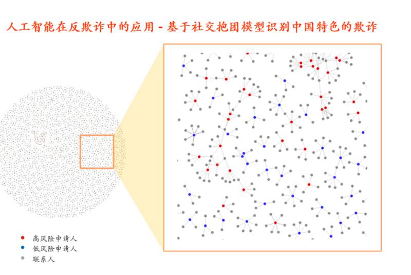 如何做到运用技术手段降低风险,识别欺诈?我们自己研制了一套基于图论的抱团模型,每个用户进来的时候,我们会把用户和他的联系人放进图中,构建用户和他人的社交关系。通过识别人和人之间的关系,判断是否有团伙欺诈的特征。