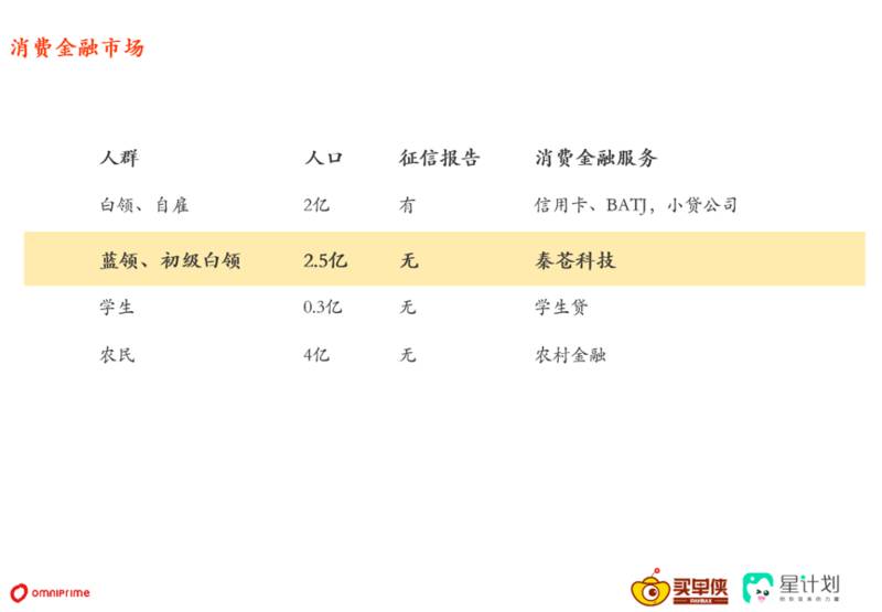 第二部分是蓝领和初级白领。他们的人群数量超过 2.5 亿,没有信贷历史,所以没有征信记录。