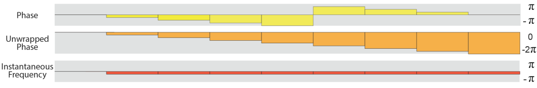 如您在上面的示例中看到的,相位是一个循环量(黄色柱状图,模 2π),但是如果我们将其解开(橙色柱状图),则每帧的减少量一个定值(红色柱状图)。我们将其称为瞬时频率 (Instantaneous Frequency, IF),因为频率的定义是单位时间的相位变化。STFT 将信号帧与许多不同的频率进行比较,结果是布满斑点的相位模式,如下图左 2 所示。相反,当我们提取瞬时频率时,如下图左 4,我们能看到出现了连续的粗线,这反映了基础声音的相干周期性。