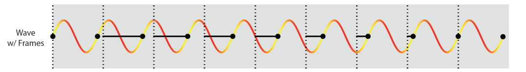 红色-黄色曲线是一个周期信号。为了便于观察,每个周期的开始处都标记了一个黑点。黑色虚线代表帧与帧之间的切割线。如果我们沿用旧方法,将信号切分成周期帧来对其建模,就像 GAN 中的上采样卷积和短时傅立叶变换 (STFT) 一样,则每帧的起点(黑色虚线)与波的起点(黑点)之间的距离不会是定值,而会随时间变化(黑色实线)。