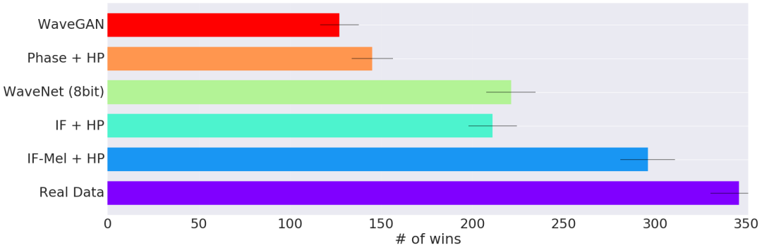 在 GANSynth ICLR 论文中,我们用一系列频谱表示来训练 GAN。结果发现对于高度周期性声音(比如音乐中的那些),为相位分量生成瞬时频率 (IF) 的 GAN 在表现上胜过其他模型和强基线,被超过的模型包括生成波形的 GAN 和无条件的 WaveNet。