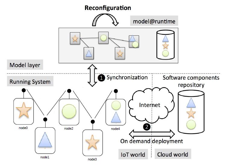 基于运行时计算模型(models@run.time)的自适应方法对传统的模型驱动工程中的模型进行了扩展,将模型的应用从设计阶段扩展到运行阶段。与模型驱动工程中的模型类似,运行时模型也是与系统有因果联系的系统的抽象表示,刻画了系统的结构、行为或者目标。因为这样的因果联系,模型可以提供及时和明确的信息以驱动后续的自适应分析和规划,在模型层次做出的自适应规划也可以被追踪到系统中。