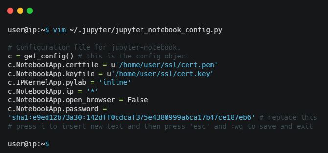 一旦你输入了密码并完成了验证,该函数将返回这个密码的散列值(在本例中,我使用了单词 password 作为密码,但你绝对不要在实际配置中使用!)。接下来复制并保存该散列值,因为我们很快就会需要它。最后,启动你最喜欢的文本编辑器来编辑 Jupyter 配置文件,如下所示: