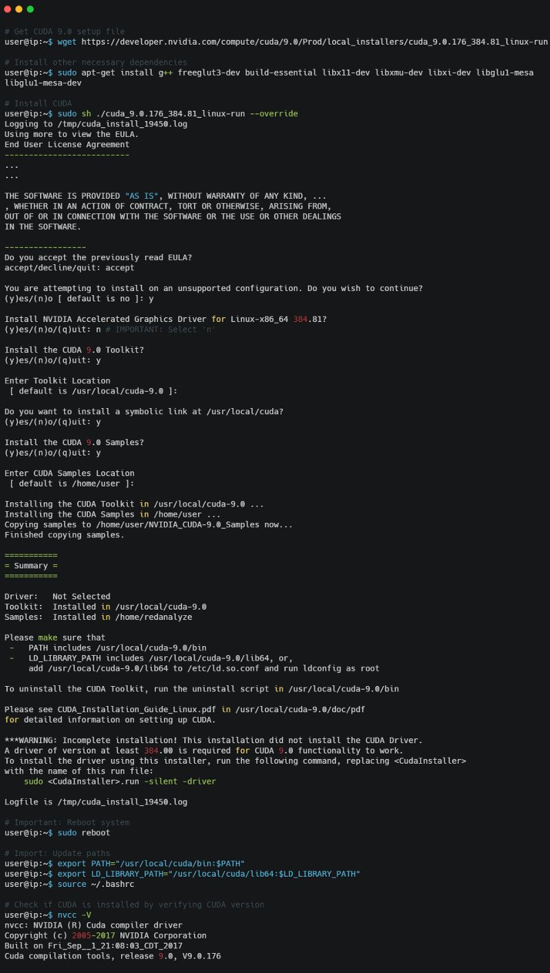 Nvidia 的 CUDA 工具包基本上是一个开发环境,它能够最大限度地利用 NVIDIA GPU。CUDA 加速库可以让你在不改动代码的前提下直接应用到多个领域:线性代数、图像和视频处理、深度学习和图形分析等。假设我们使用 Ubuntu 的系统,你可以进入官方的 NVIDIA CUDA 页面并下载必要的安装文件。在写本文的时候,因为 CUDA 10 刚刚发布,我们因此使用了老版本的 CUDA 9.0,你可以从 历史版本页面 下载。如果你是在一个远程服务器上运行,可参照下图,使用终端直接下载安装文件并配置。