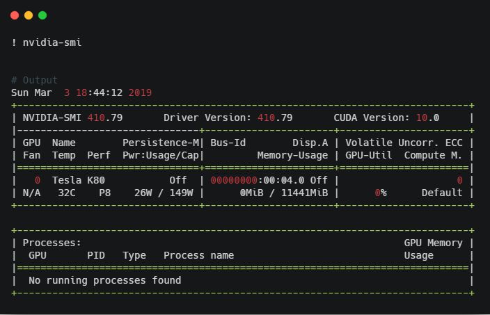 完成上述操作后,Google Colab 将申请一个新的基于 GPU 的深度学习环境,我们可以使用如下指令查看 GPU 类型: