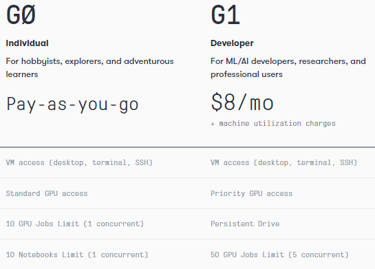 以下是他们的一些基本用户方案 (更多方案信息参阅 https://www.paperspace.com/pricing)。