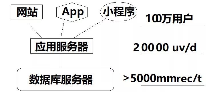 往往项目初期,为了迅速的证明自己的点子靠谱,拿到市场,我们会选择这样的架构来实现产品。此时往往 10 万用户注册了,但每天访问的人数刚过 200,每张数据库表的总数,最大也不会超过 5000 条。