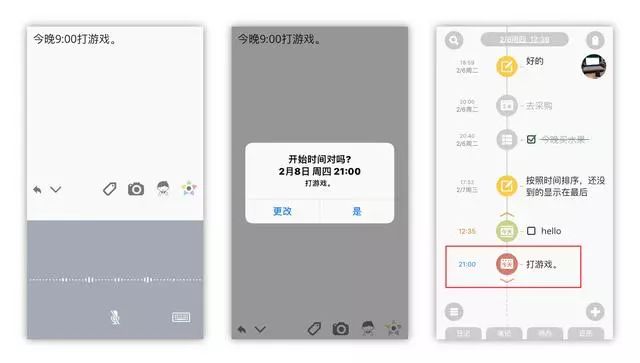 如果你记录的是日程,Pendo 还可以自动识别语义,比如我只要直接输入“今晚9点笔尖星球吃鸡”,Pendo 就能够帮你在 iOS 中设置闹钟,并把事情记录为“笔尖星球吃鸡”,然后将日程添加到 Timeline 中,如果你觉得打字麻烦,还可以直接语音输入,类似Siri.