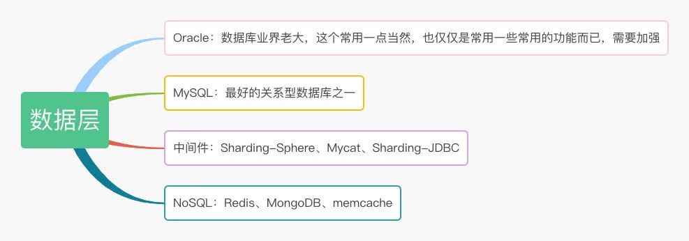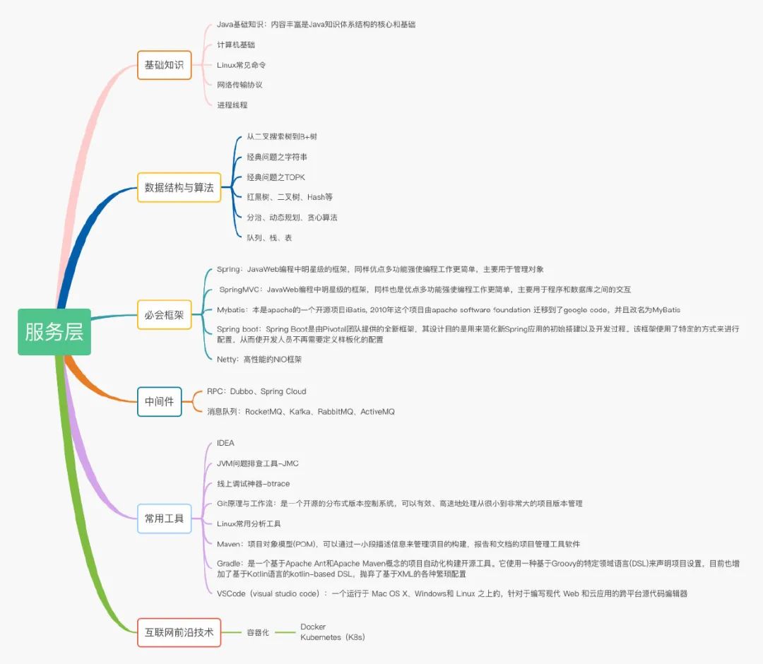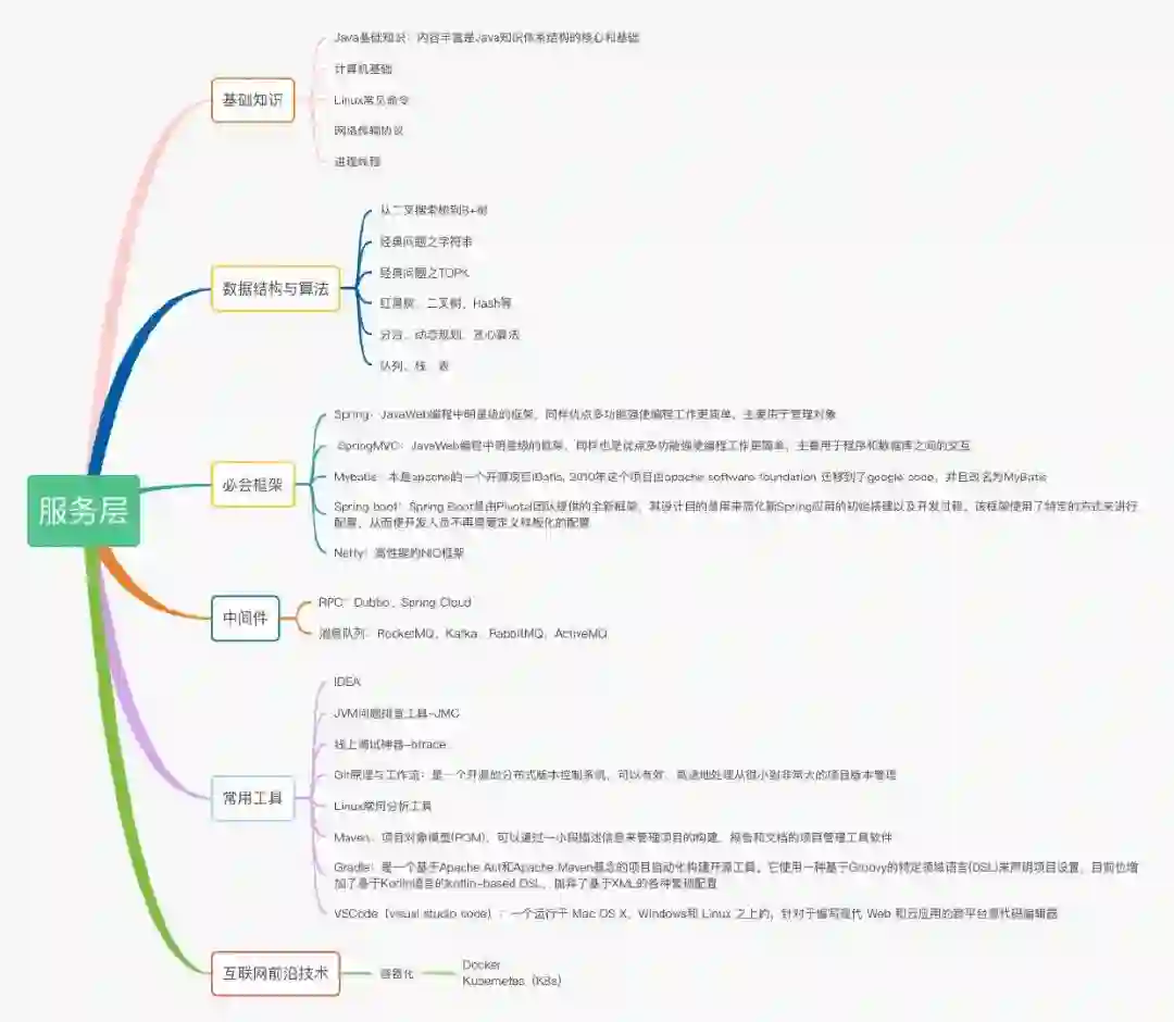 这一层有点东西了,算是整个框架的核心,如果你跟敖丙一样以后都是从事后端开发的话,我们基本上整个技术生涯,大部分时间都在跟这一层的技术栈打交道了,各种琳琅满目的中间件,计算机基础知识,Linux 操作,算法数据结构,架构框架,研发工具等等。
