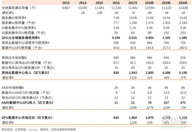 从市场容量/前景来看,云计算数据中心成为不可逆转的趋势,超级数据中心也越来越依赖GPU来更快地处理高要求的工作负载。目前,全球服务器中GPU的渗透率仅有 0.24%并基本被英伟达垄断,天风证券预计英伟达数据中心业务在2020年前将达40亿美元,对应全球服务器GPU 渗透率也将达 4 倍以上增长。
