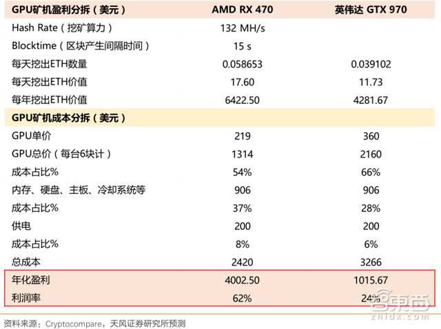 根据 cryptocompare 网站数据,AMD RX 470 GPU的矿机有明显优于英伟达 GTX 970 GPU 的经济回报,为了有效消弭挖矿和游戏需求冲突,并避免二手卡问题,英伟达针对虚拟数字货币挖矿热潮推出专门挖矿显卡(基于 GTX 1060 6GB 产品,完全取消显示输出接口,仅提供 90 天的质保);AMD 则发布了专门的挖矿驱动 Radeon Software Crimson ReLive Edition Beta for BlockchainCompute,为区块链计算工作负荷优化性能。