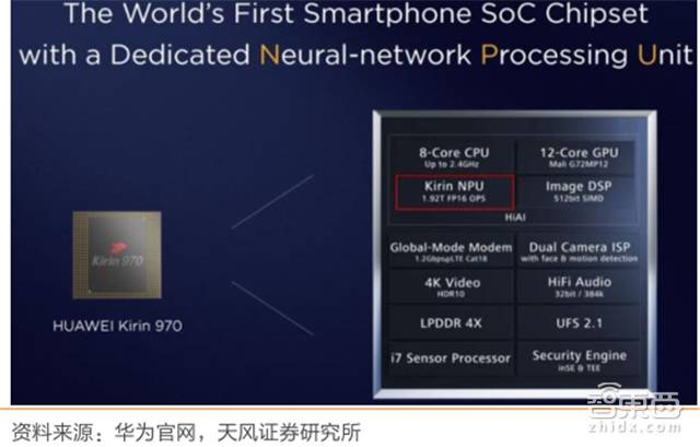 另一个吃螃蟹的企业就是咱们的华为——麒麟 970。麒麟 970 采用 10nm 制程,搭载 Cortex-A73(CPU)、Mali-G72(GPU)和麒麟 NPU(神经网络处理单元)。其中,麒麟 NPU 采用了寒武纪的IP(1A芯片),目的是解决端侧AI(On-Device AI)。